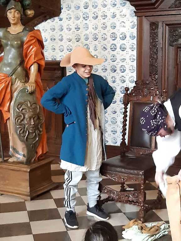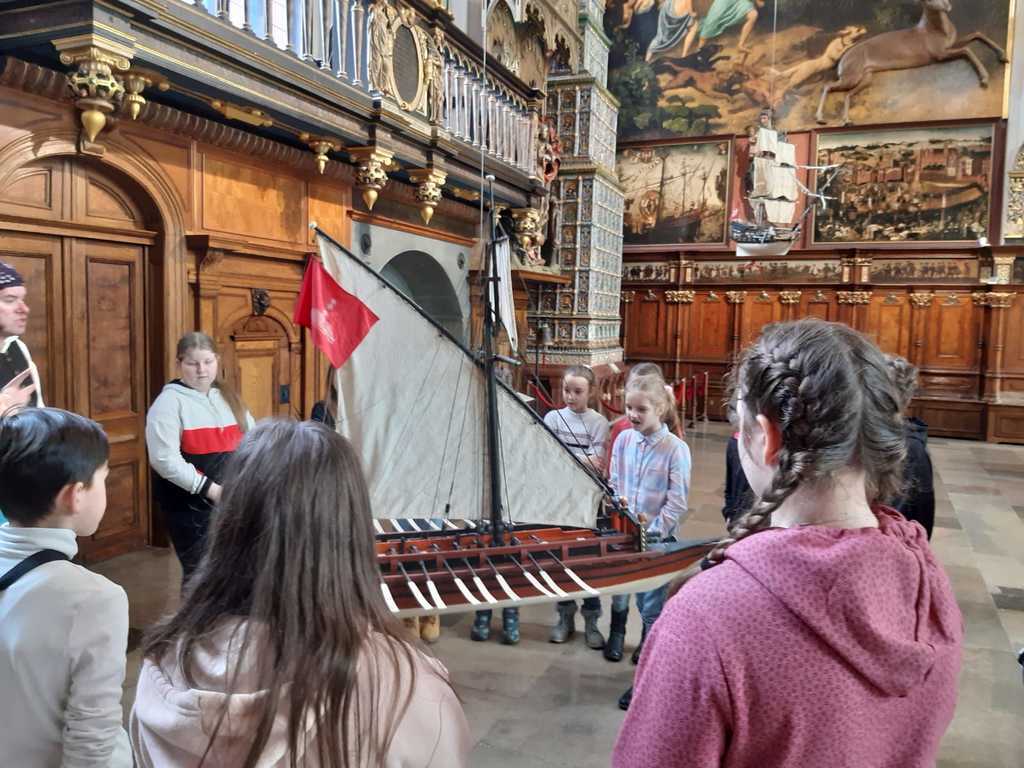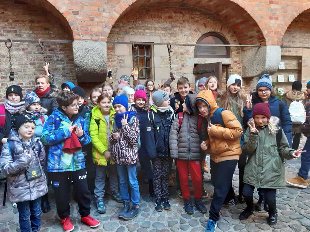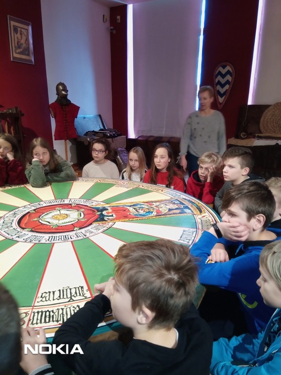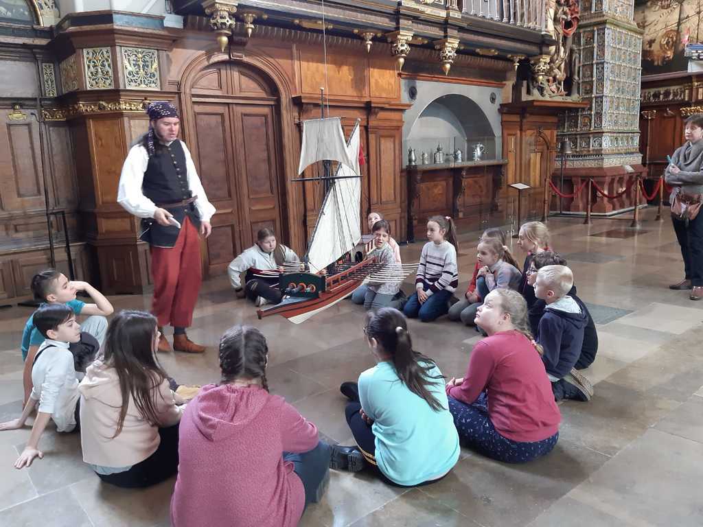 Następnie udano się na warsztaty do Dworu Artusa, by dowiedzieć się skąd taka nazwa i jaka jest historia tej budowli. Uczniowie dowiedzieli się , że historia pochodzenia nazwy Dworu Artusa związana jest z rycerzem Arturem i pierwotna funkcja tego miejsca powiązana była właśnie z rycerstwem. Potwierdza to fakt, że dwór ten został wzniesiony przez Bractwo Św. Jerzego w połowie XIV wieku. Największe wrażenie, które wzbudziły zachwyt uczniów to elementy wyposażenia sali, które dają pewne wyobrażenie o tym, jak piękne i oryginalne musiały być to wnętrza za czasów ich świetności. W samej sali, oprócz zwisających z sufitu, niczym na pajęczynach, modeli okrętów, uwagę przykuwa wielki 11-metrowy piec kaflowy, bogato zdobiony popiersiami władców europejskich. Pani przebrana za rycerkę pięknie opowiadała, jak za dawnych czasów wyglądało życie na tym dworze i w dawnym Gdańsku. Potem uczniowie przenieśli się do sali rycerskiej, gdzie czekała na nich wystawa dotycząca czasów współczesnych Królowi Arturowi. Można było tam m.in. zasiąść, tak jak niegdyś rycerze Króla Artura, przy okrągłym stole - symbolu równości i partnerstwa. Można było poczuć się rycerzami, przebierając się w zbroję i próbując walczyć mieczem. Taka podróż w czasie bardzo zaciekawiła i pozwoliła przenieść się w świat legend, opowieści o rycerzach, sławnych bitew, pięknej sztuki i moralizujących obrazów. Potem jeszcze spacer na wyspę Ołowiankę i z zadowolenemi można było wrócić do domu.