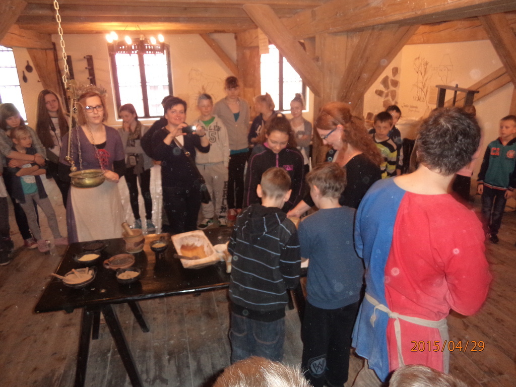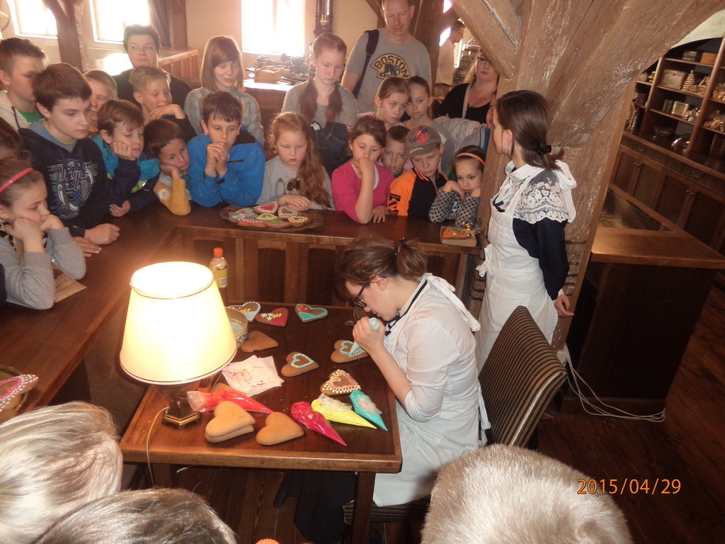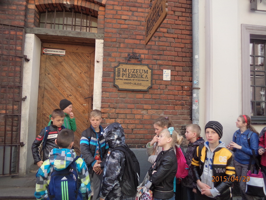 W środę 29 kwietnia 2015r. uczniowie klas IV – V oraz gimnazjum odwiedzili stary, piękny, pachnący piernikami Toruń. Mimo chłodu, jaki nas przywitał w mieście, było wesoło i miło. Z pewnością wielką atrakcją była wizyta w Muzeum Piernika. Przywitała nas wiedźma i mistrz pieczenia piernika. Najpierw była przysięga złożona przez uczniów, potem nauka robienia pierników. Każdy miał za zadanie zrobić swój własny, niepowtarzalny piernik. Potem niektórzy ćwiczyli umiejętność zdobienia pierników, co jest sztuką niezwykle trudną.