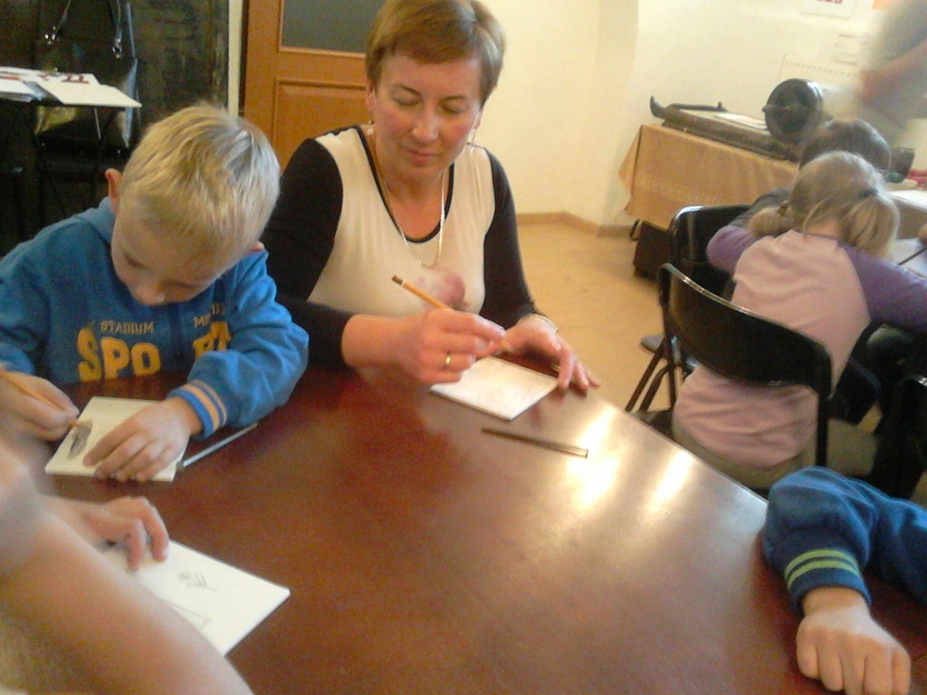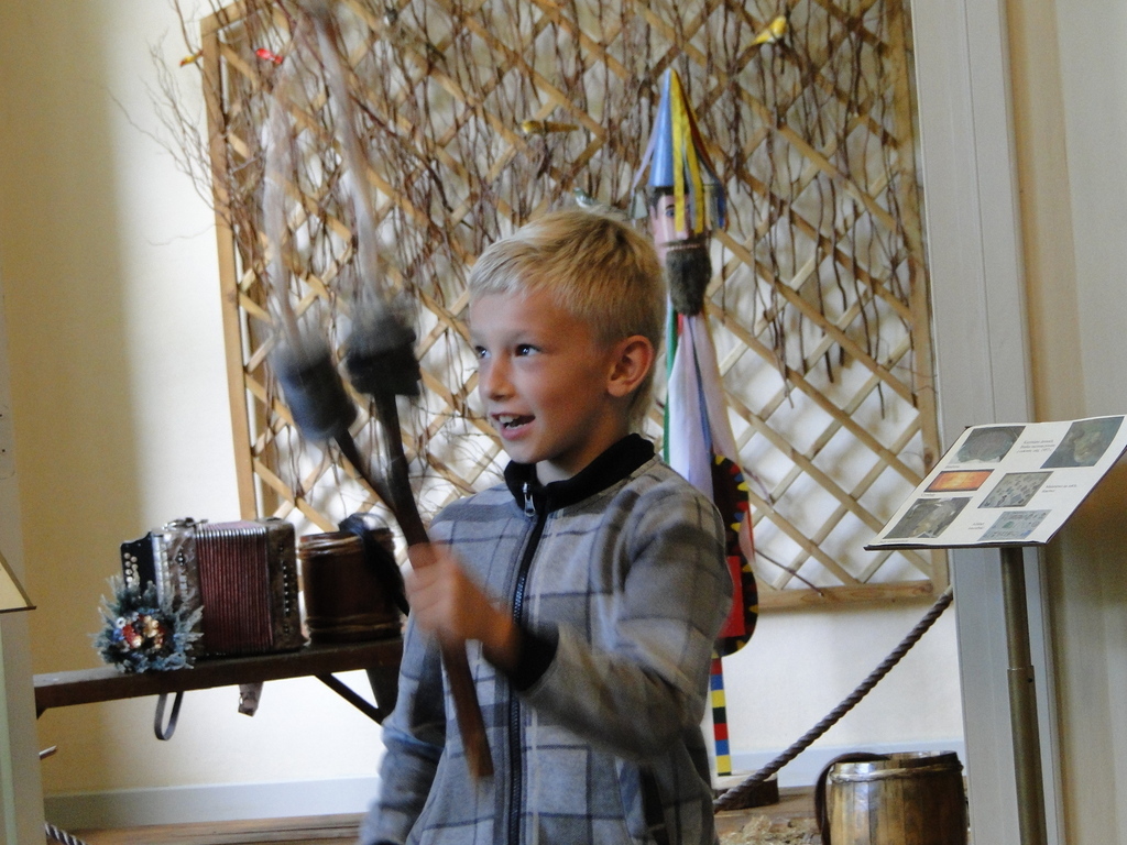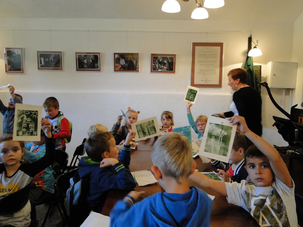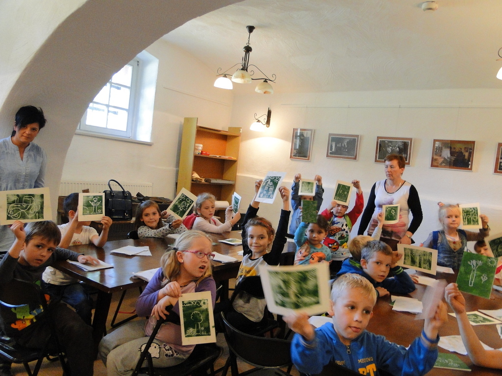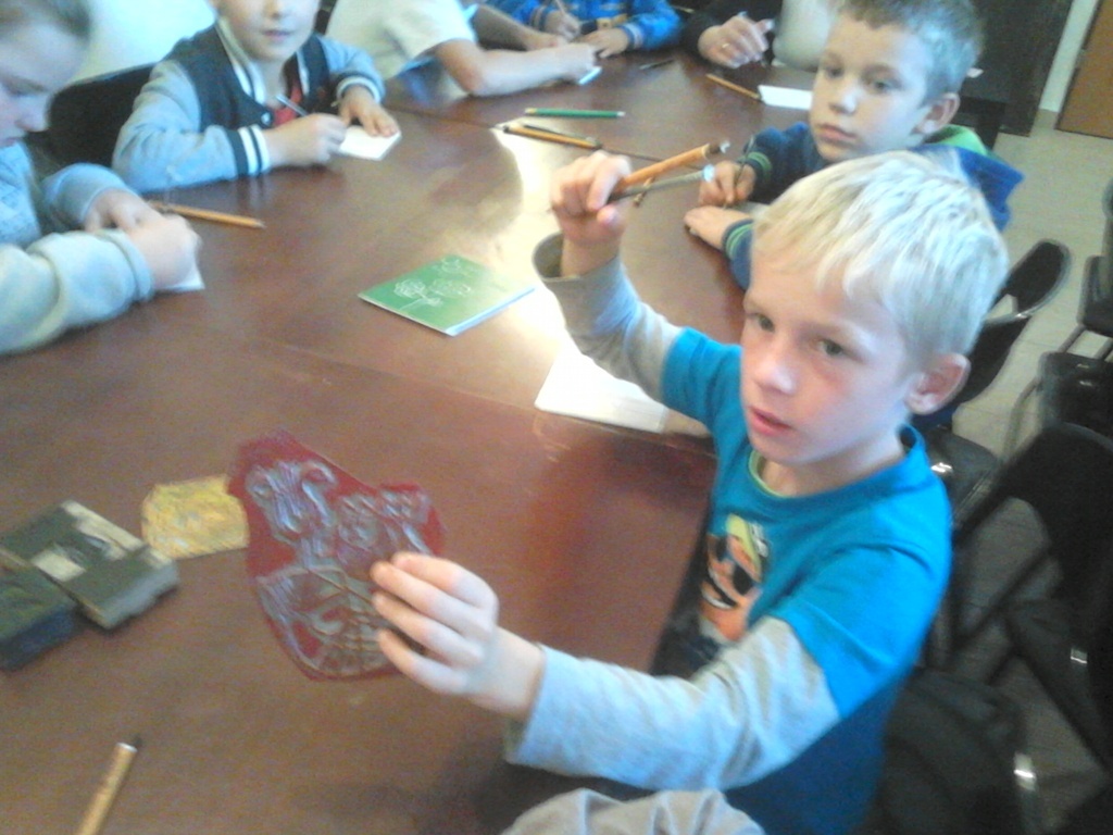 Bardzo ciekawa okazała się prezentacja instrumentów kaszubskich. Dzieci miały okazję zaśpiewać przy akompaniamencie diabelskich skrzypiec i bazuny. Druga część zajęć to warsztaty z litografii. Uczniowie sami wykonywali pieczęcie, z których następnie odbito obrazki. Przeważały krajobrazy, domki i kwiatki. Obrazki te podziwiać można na wystawie w szkole.