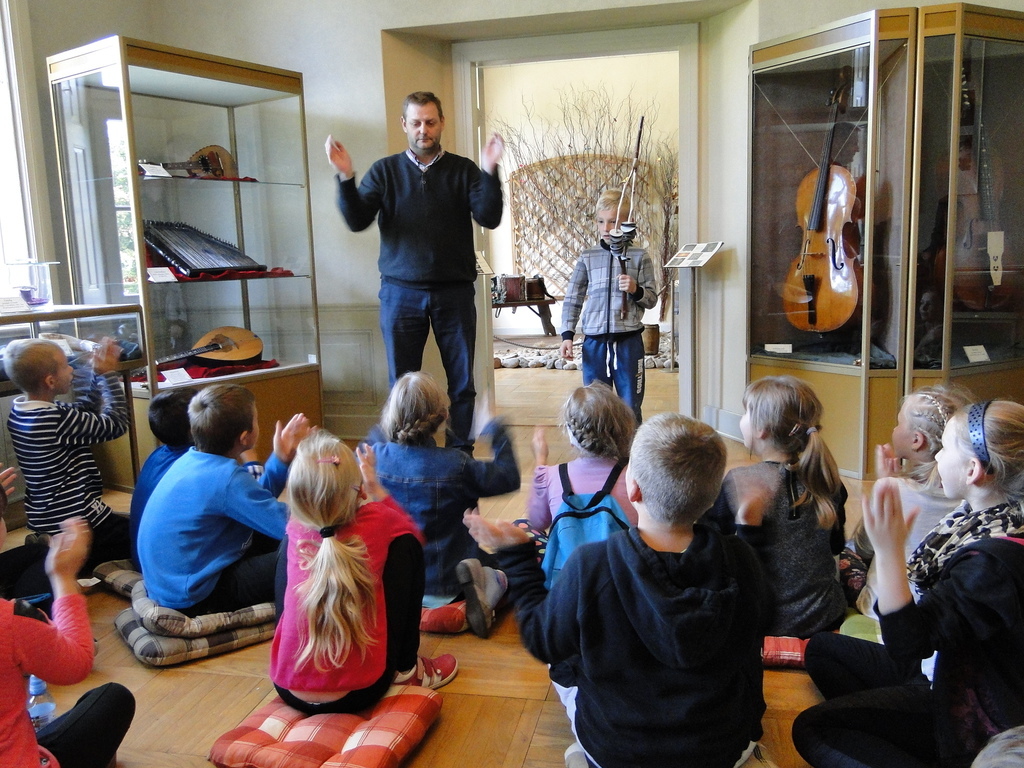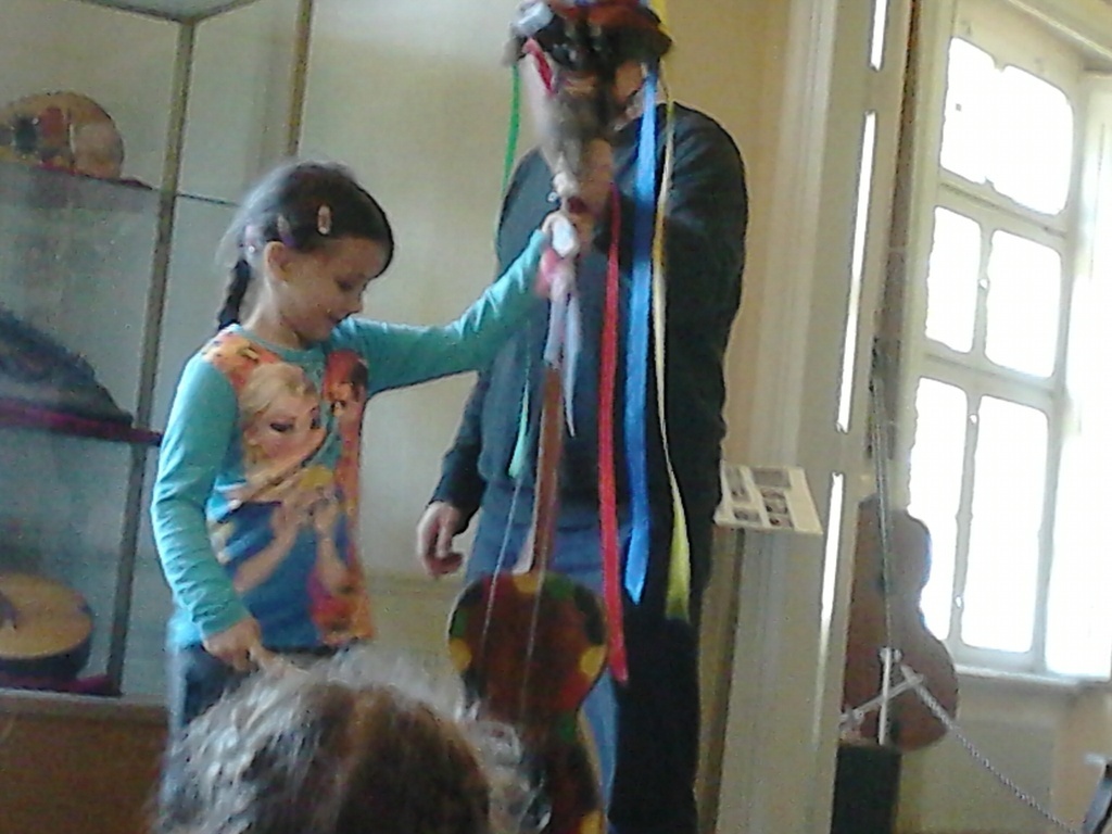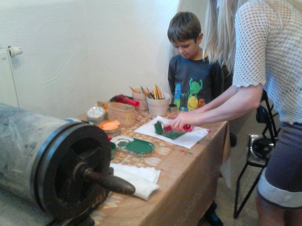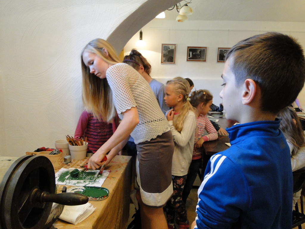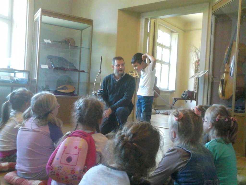 Bardzo ciekawa okazała się prezentacja instrumentów kaszubskich. Dzieci miały okazję zaśpiewać przy akompaniamencie diabelskich skrzypiec i bazuny. Druga część zajęć to warsztaty z litografii. Uczniowie sami wykonywali pieczęcie, z których następnie odbito obrazki. Przeważały krajobrazy, domki i kwiatki. Obrazki te podziwiać można na wystawie w szkole.