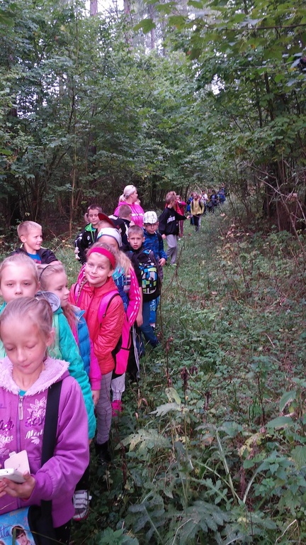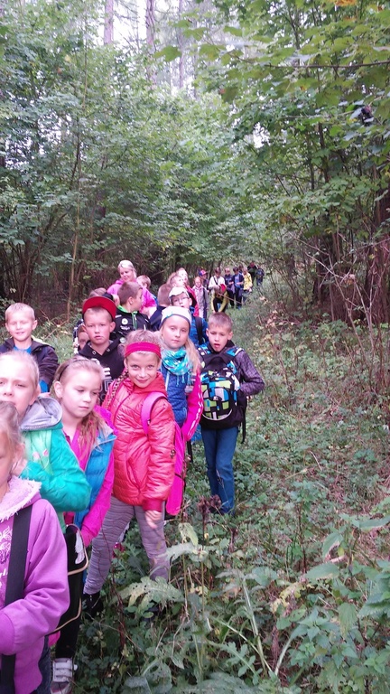 W dniu 5.10.2015 roku uczniowie klasy III i IV wraz z wychowawczyniami J.Jacyniak -Stojek i M. Wojtysiak wybrali się na ścieżkę ekologiczną do Leśnic. Głównym celem wyprawy była obserwacja naturalnego ekosystemu świata roślin i zwierząt. Podczas tej jesiennej wycieczki dzieci poznawały warstwową budowę lasu, występujące tam rośliny i zwierzęta. Piękna pogoda, świeże powietrze zachęcały ich do edukacyjnego spaceru. Po długiej, ale ciekawej wędrówce odpoczywali przy ognisku piekąc pyszne kiełbaski. W drodze powrotnej jeszcze kilka chwil na ścieżce sprawnościowej zbudowanej przez leśników i wszyscy zadowoleni wracali do szkoły. Miło było spędzić czas na łonie natury, delektując się złotą polską jesienią.