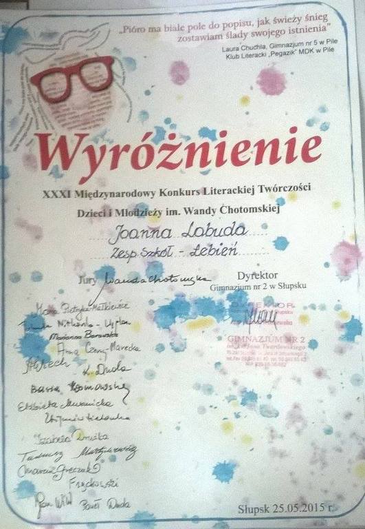 Uczennica klasy III a Gimnazjum, Joanna Labuda, otrzymała wyróżnienie w XXXI Międzynarodowym Konkursie Literackiej Twórczości Dzieci i Młodzieży im. Wandy Chotomskiej. Na konkurs nadesłano 6138 zestawów wierszy i opowiadań z 487 szkół podstawowych, gimnazjów i ze szkół ponadgimnazjalnych – z całej Polski, Stanów Zjednoczonych, Niemiec i Litwy. Tym bardziej cenny jest sukces Joanny Labudy, gdyż jury przewodniczyła Wanda Chotomska, znana poetka. Joanna została nagrodzona za opowiadanie pt. „Prawdziwe uczucie”, a nagroda została wręczona 25 maja 2015r. podczas uroczystej gali w Polskiej Filharmonii Sinfonia Baltica w Słupsku. Życzymy naszej uczennicy dalszych sukcesów w karierze pisarskiej.