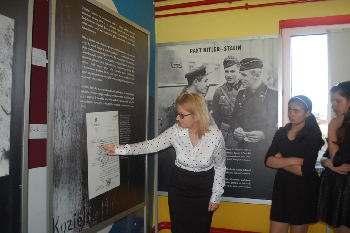 Od 21 kwietnia do 6 maja br. w naszej szkole po raz kolejny gościła wystawa udostępniona nam przez Instytut Pamięci Narodowej z Gdańska. Nie pierwszy raz dotyczyła ona Zbrodni Katyńskiej. Jesteśmy z tą tematyką związani wyjątkowo, gdyż od 2010 roku przed naszą szkołą rośnie piękny dąb poświęcony pamięci Pana Stanisława Szeflera, który zginął w 1940 roku w Twerze. Nauczyciel historii- Pani Elżbieta Laskiewicz prowadziła lekcje dla młodzieży przy wystawie "Zbrodnia Katyńska". Cieszyła się ona wśród uczniów dużym zainteresowaniem.