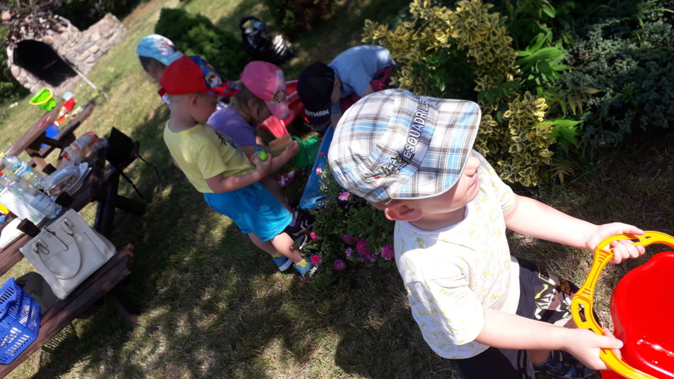 Na miejscu czekał na maluszków Pan Ryszard Matak- tata Jasia, który zafundował dzieciom świetną zabawę. Wszystkie maluchy ruszyły w kierunku trampoliny. Wielka piaskownica przypadła przedszkolakom do gustu, zwłaszcza, że zabawek mieli tyle, że nie wiadomo było, którą się bawić. Koce, woda i lody pozwoliły wszystkim się ochłodzić. Dzieci pamiętały także o roślinach i ruszyły im z pomocą biorąc małą konewkę z wodą do ręki. W tym czasie kiedy Minionki szalały, grały w piłkę, jeździły autami i częstowały się ciastkami, to tata Jasia dbał o to, aby maluchy nie wyszły głodne. Kiełbaska z grilla była miłą niespodzianką.