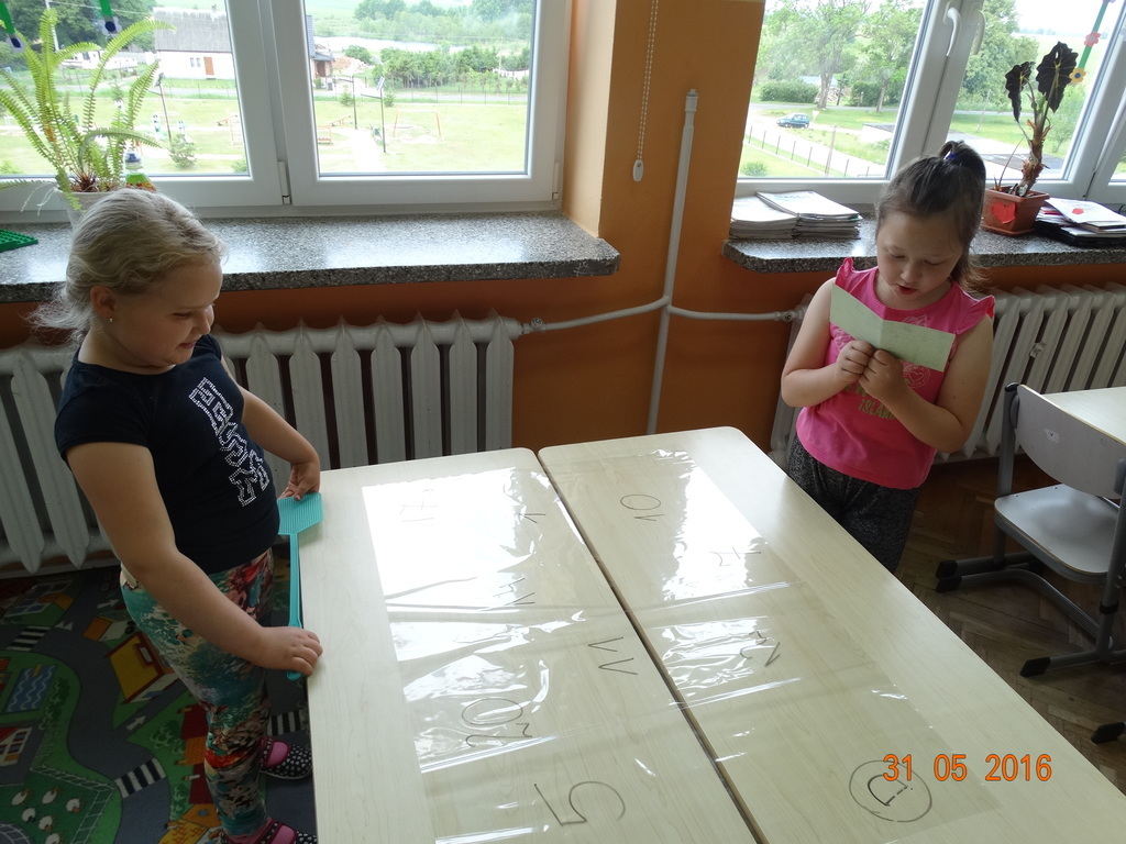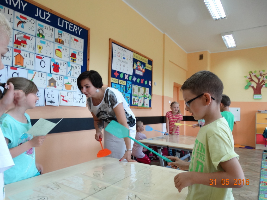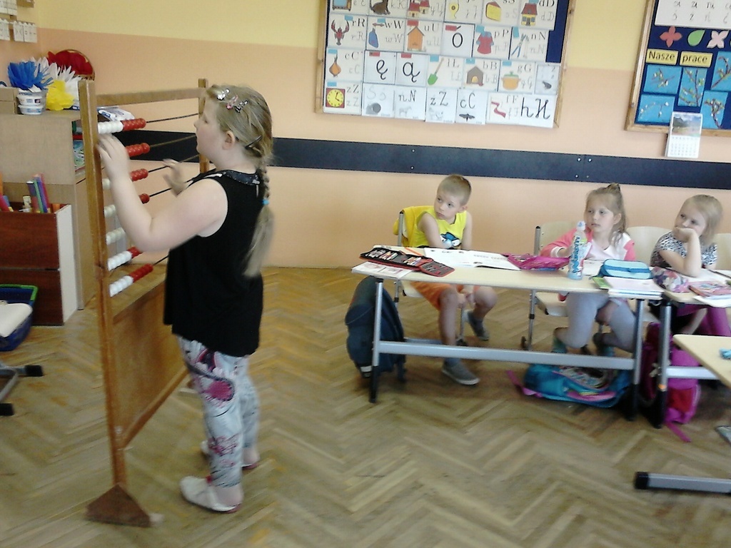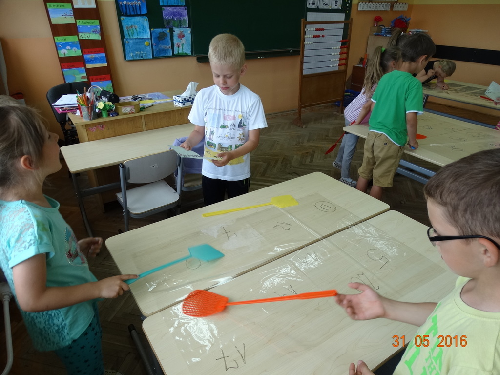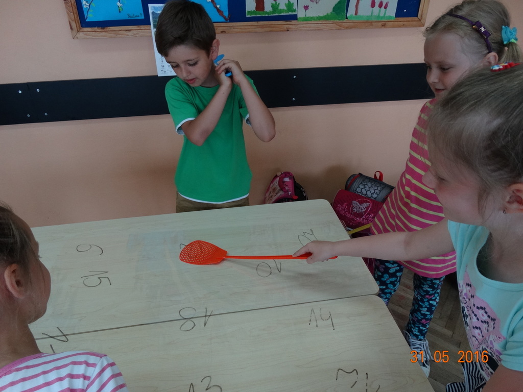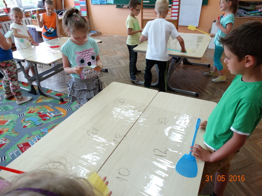 Matematyka może być naprawdę ciekawa i zabawna. Dzieci z klasy 1a często przekonują się o tym na lekcjach. Ostatnio zabawy matematyczne pomagają opanować dzieciom liczenie w zakresie 20 z przekroczeniem progu dziesiątkowego w łatwy i przyjemny sposób. Ulubioną zabawą pierwszaków jest zabawa z klapkami na muchy. Prowadzący czyta działanie, a dzieci ścigają się kto pierwszy "klapnie" prawidłowy wynik. Śmiechu i liczenia jest równie dużo.