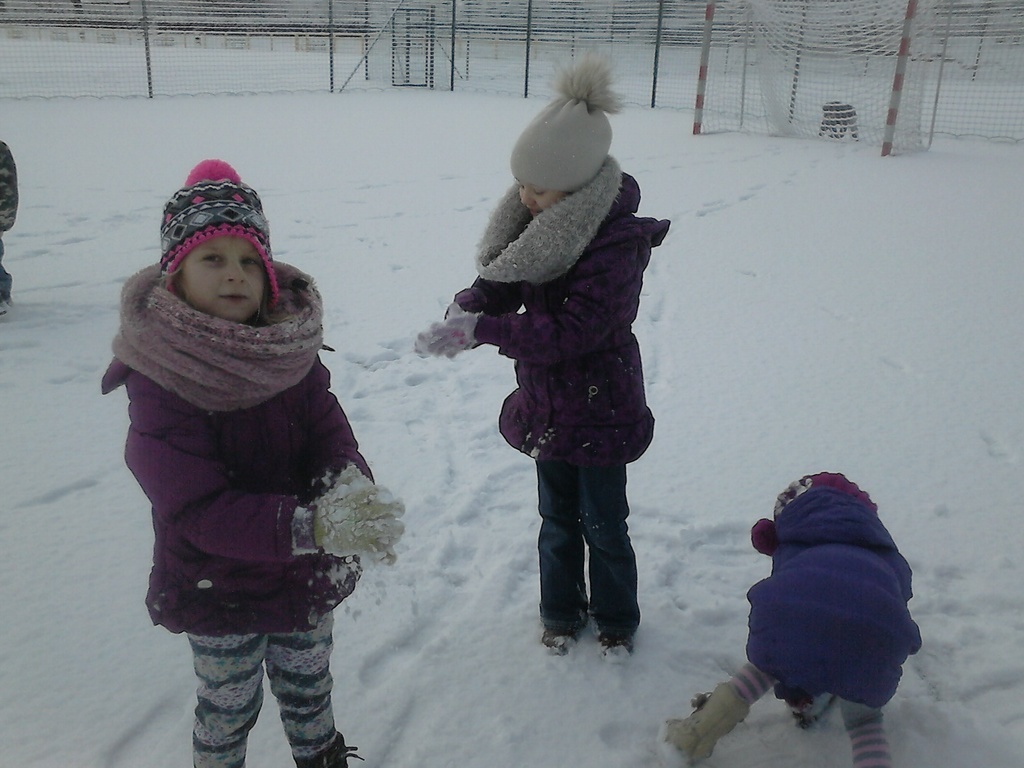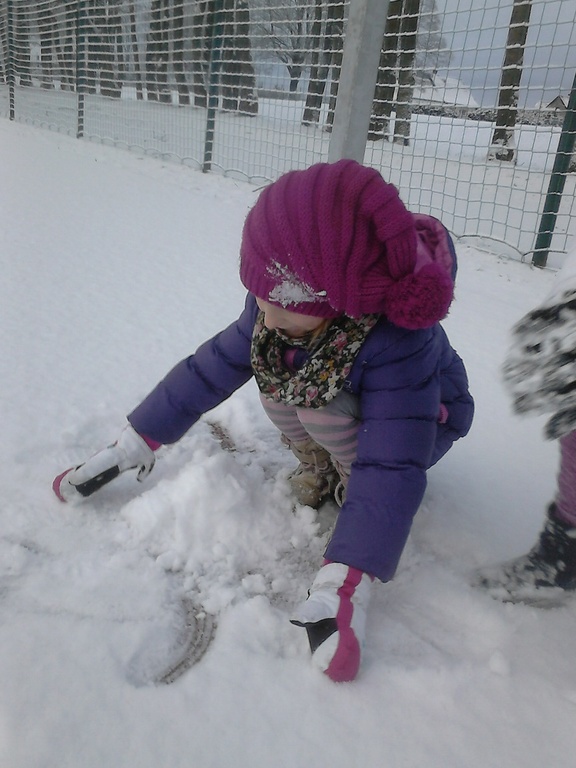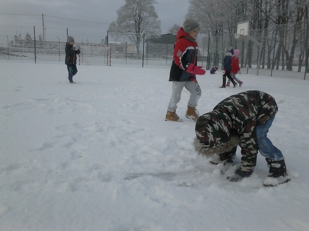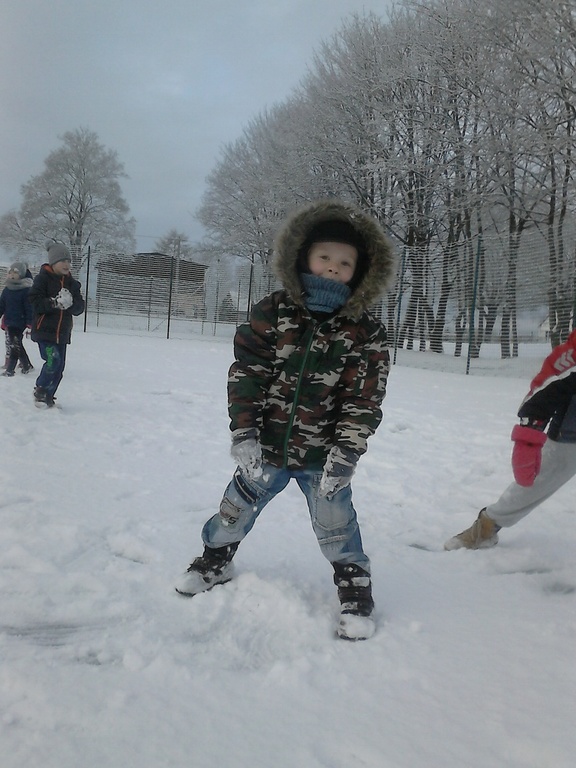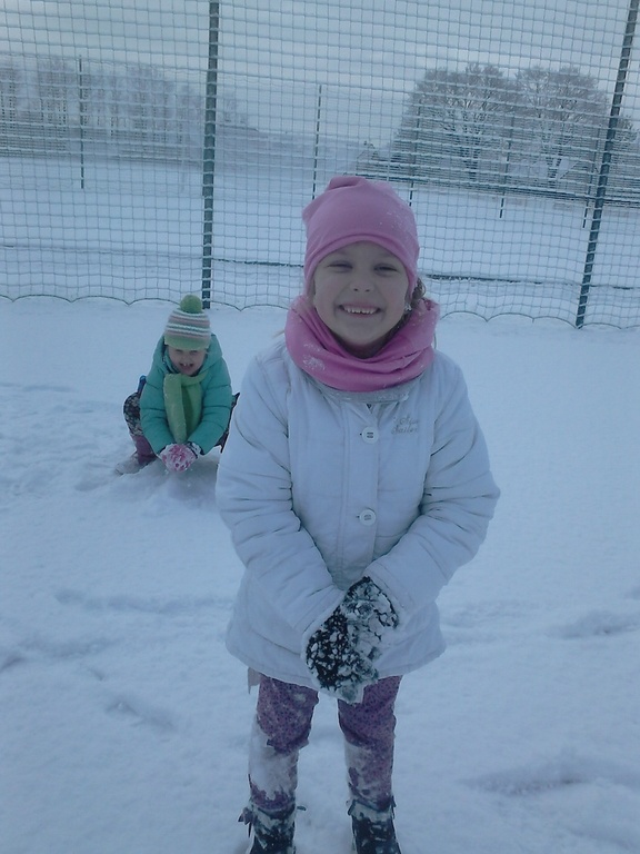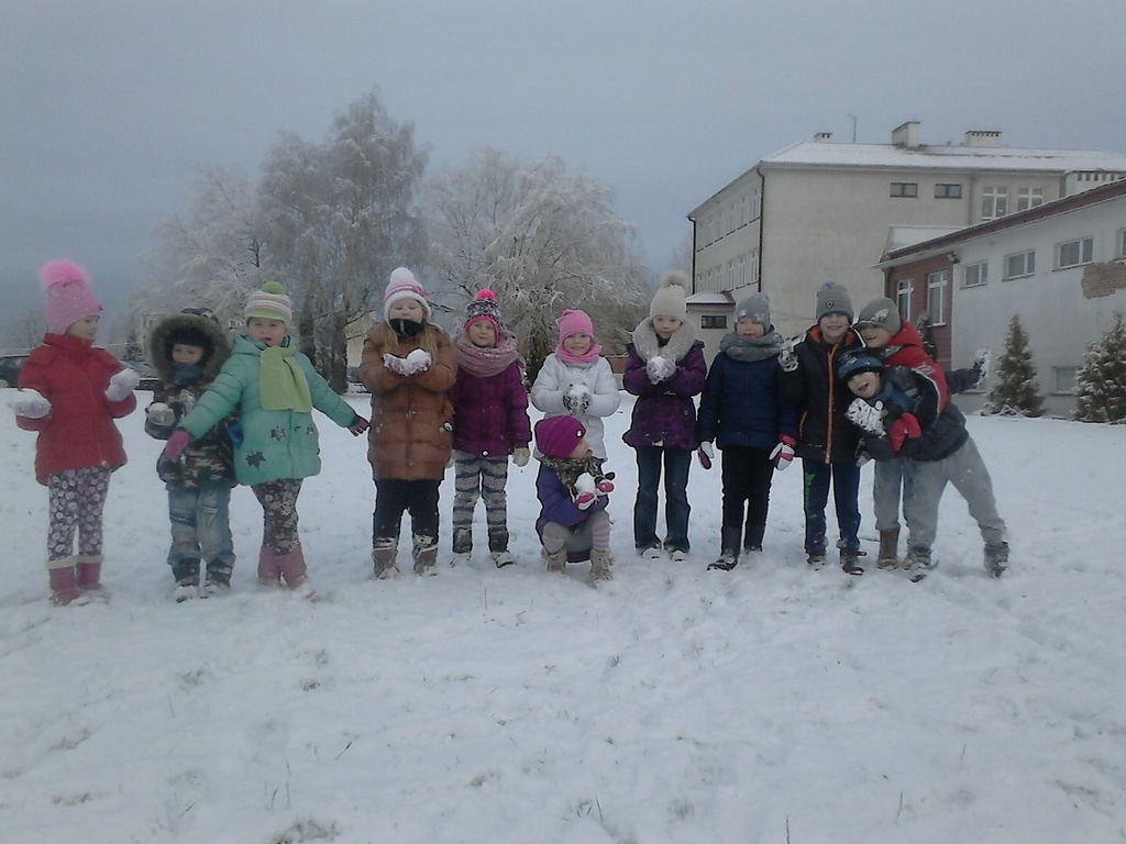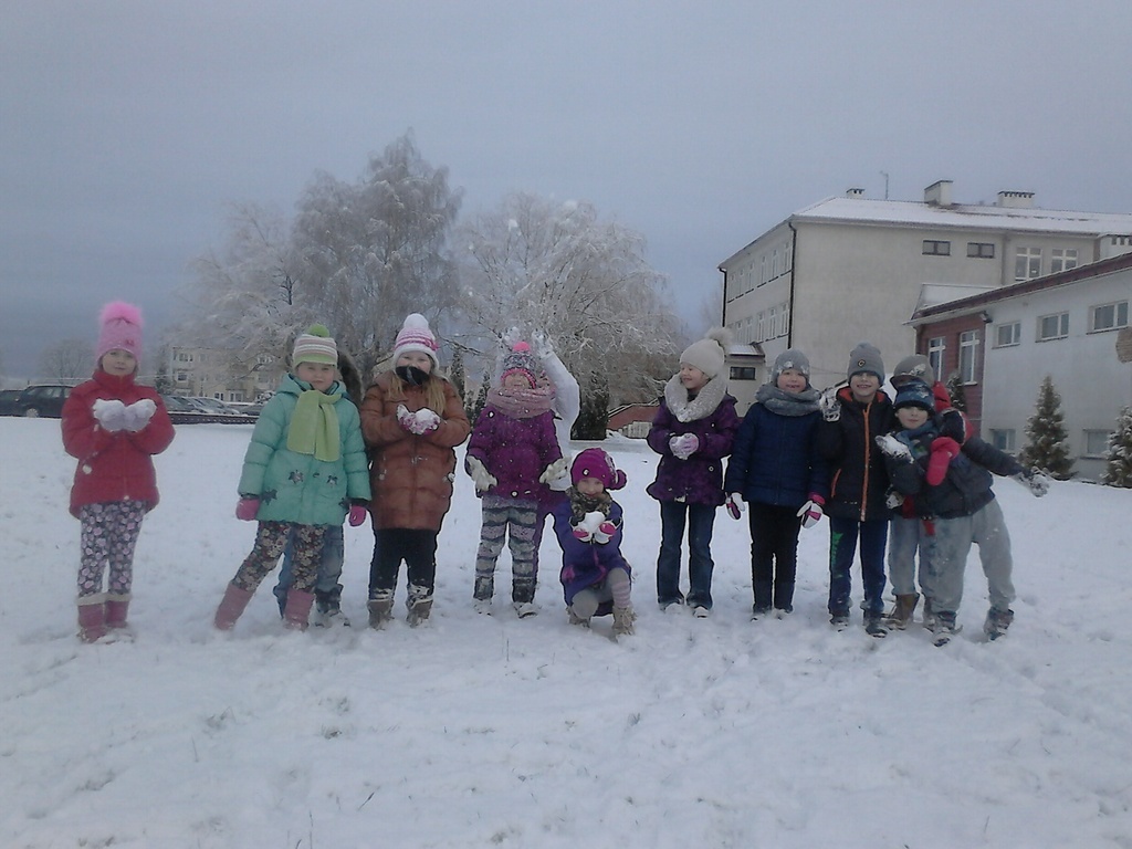 Długo dzieci czekały na śnieg, więc jak tylko się pojawił, pierwszaki nie mogły już usiedzieć w ławkach. Trochę zabawy na białym puchu, a radości co nie miara. Rumiane i szczęśliwe wróciły do ławek. Następnym razem ulepimy bałwana!