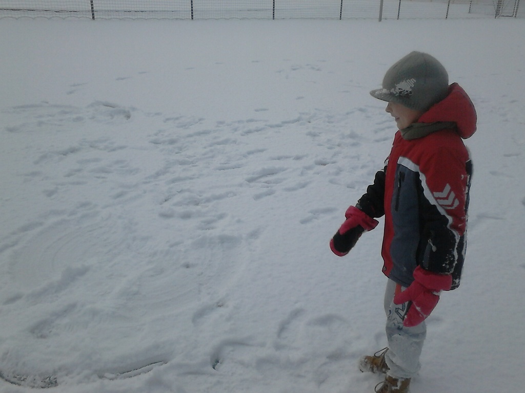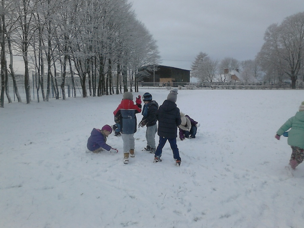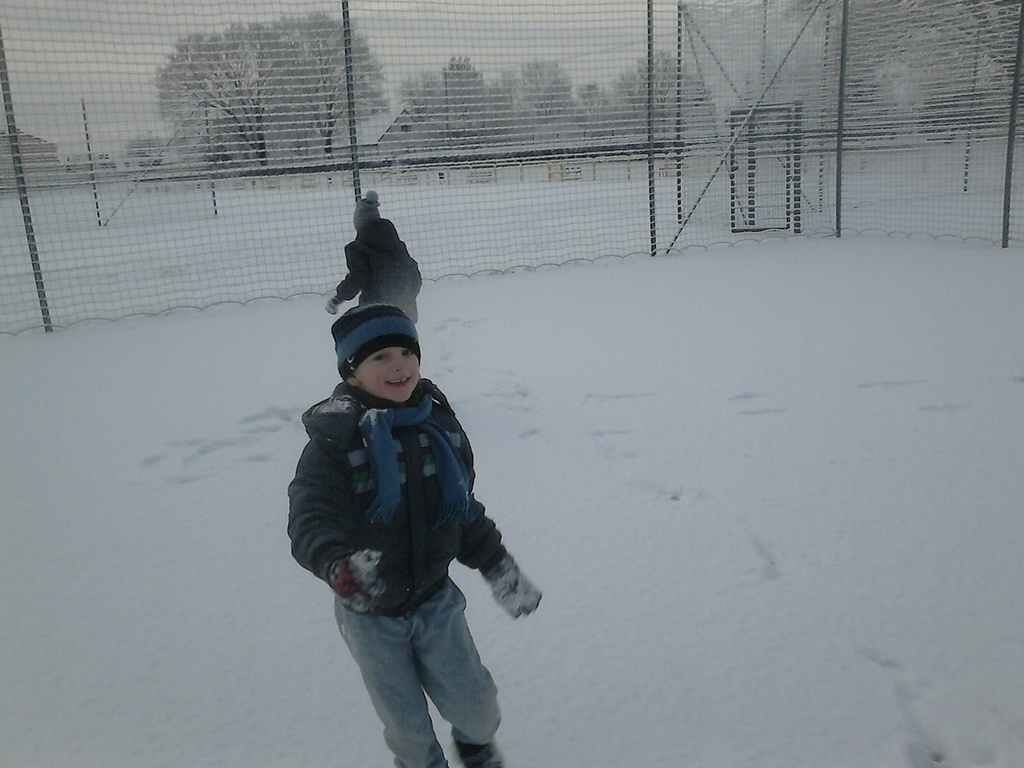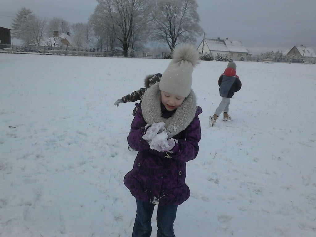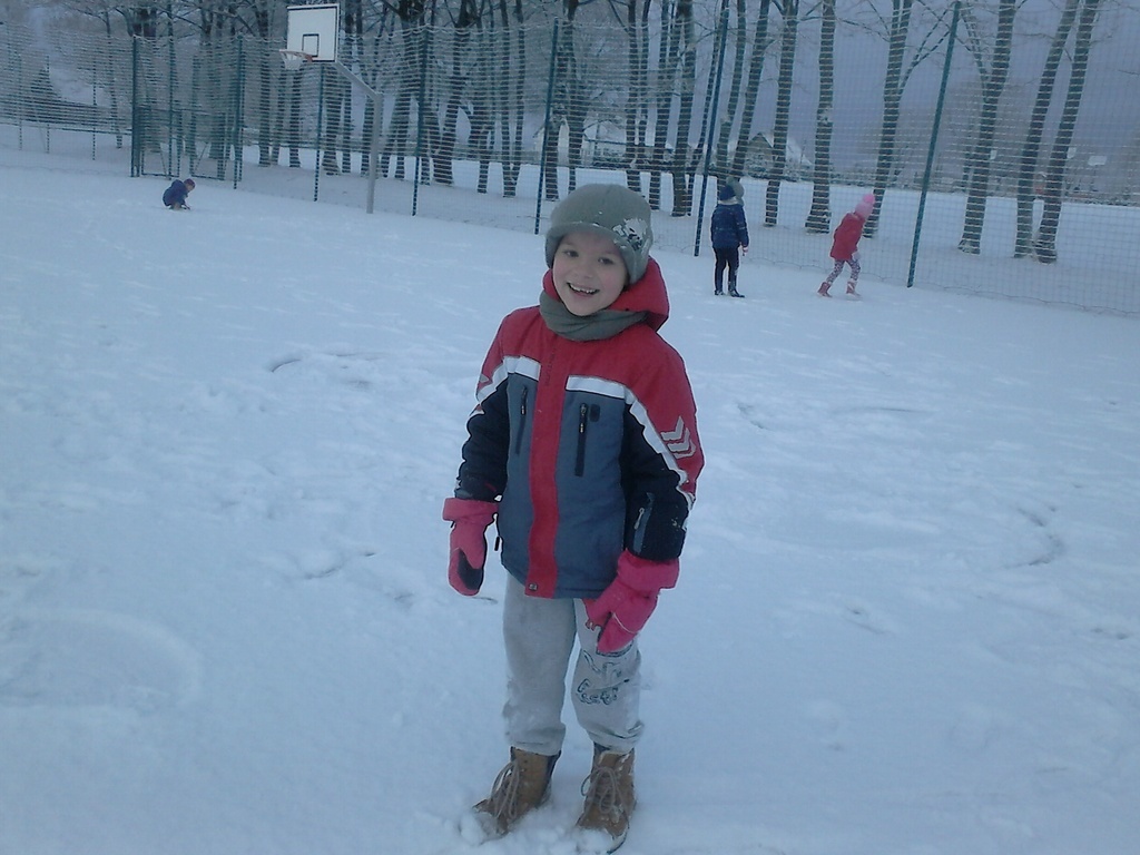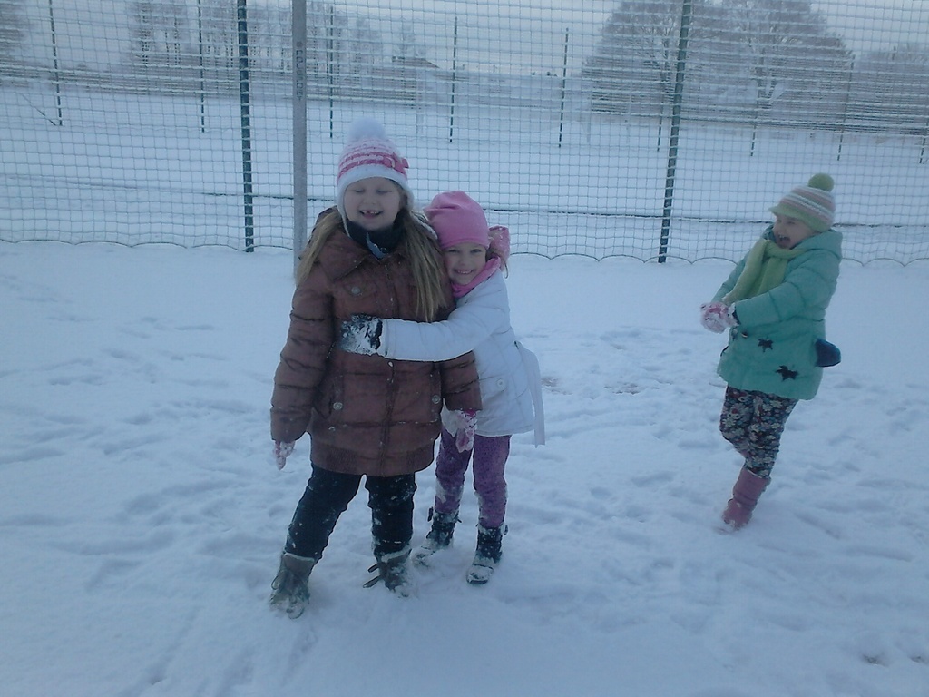 Długo dzieci czekały na śnieg, więc jak tylko się pojawił, pierwszaki nie mogły już usiedzieć w ławkach. Trochę zabawy na białym puchu, a radości co nie miara. Rumiane i szczęśliwe wróciły do ławek. Następnym razem ulepimy bałwana!