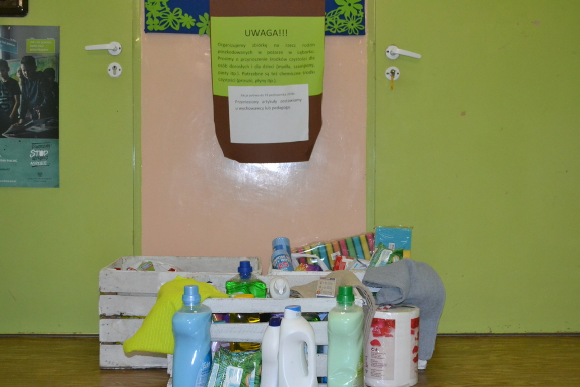 Bardzo dziękujemy rodzicom, uczniom, dzieciom, nauczycielom i pracownikom szkoły za włączenie się do zbiórki środków czystości dla rodzin poszkodowanych w pożarze w Lęborku. Wszystkie dary zostały przekazane do Miejskiego Ośrodka Pomocy Społecznej w Lęborku, który dostarczy je rodzinom.